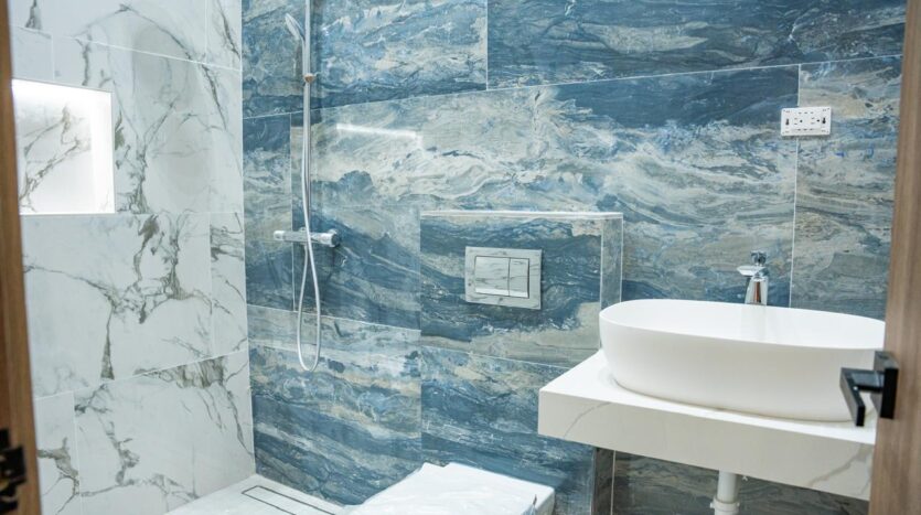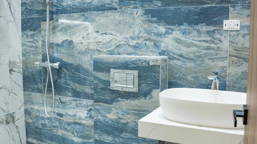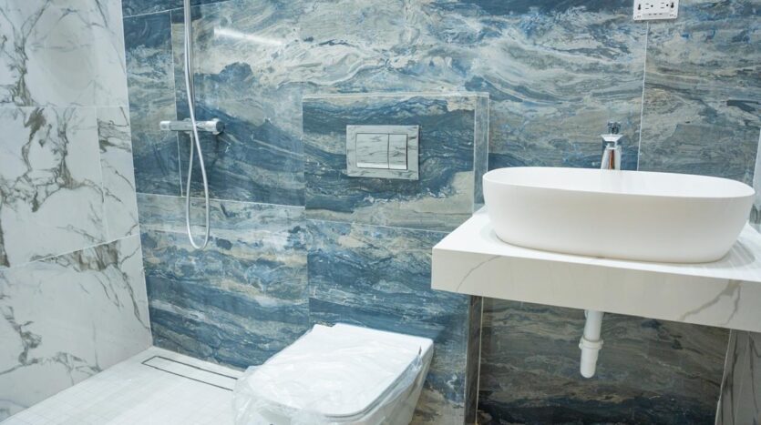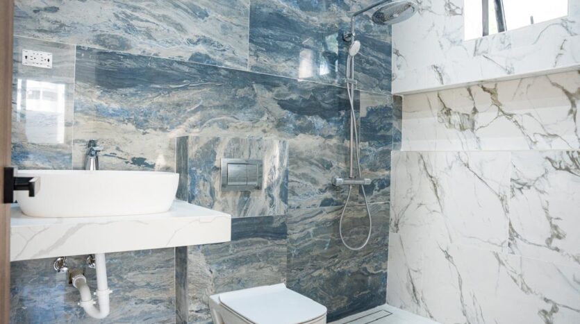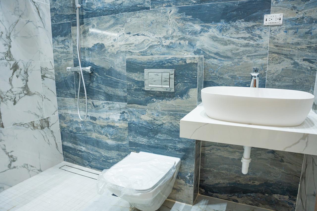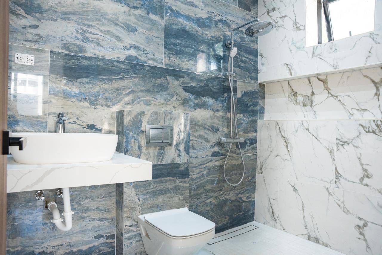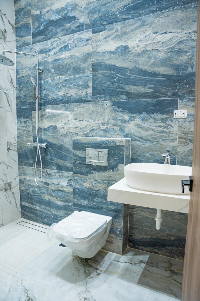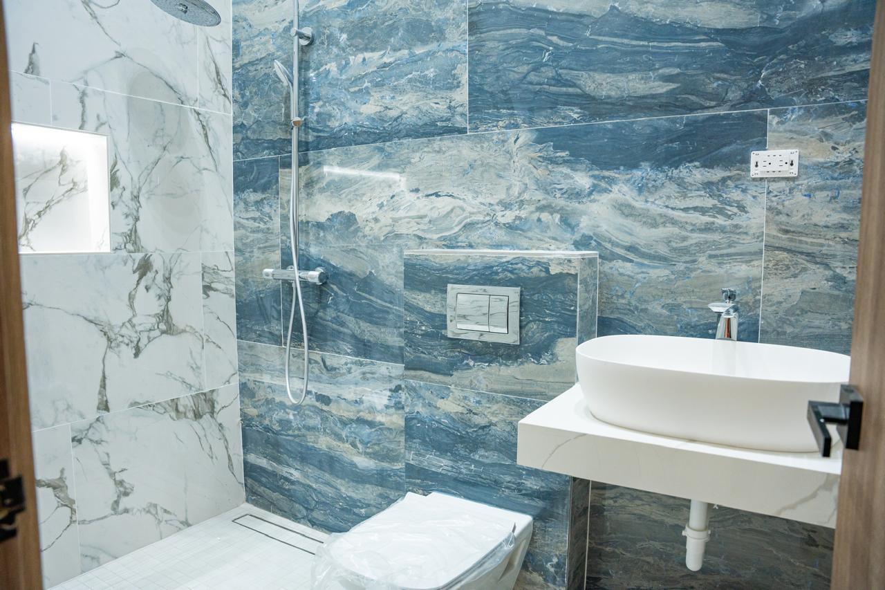 Desde el porcelanato en gran formato hasta los inodoros suspendidos y las ventanas de muro cortina en fachada frontal, cada detalle habla de calidad y visión.